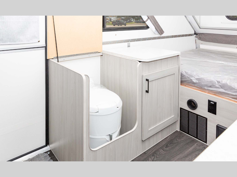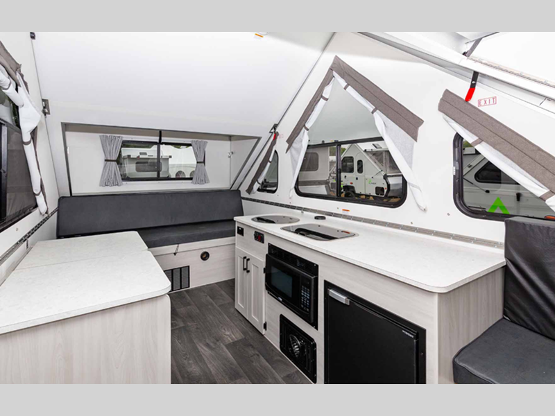 Each is built lightweight with an Azdel composite roof/sidewalls, and includes aluminum wheels, a Dexter rubber torsion axle, and a gray exterior fiberglass. There are also 14" tires, four stabilizer jacks, plus high wind lift assist. The interior offers 30% more storage room, more living space, taller counter tops, a taller bed, and the highest capacity chassis in the Aliner brand.