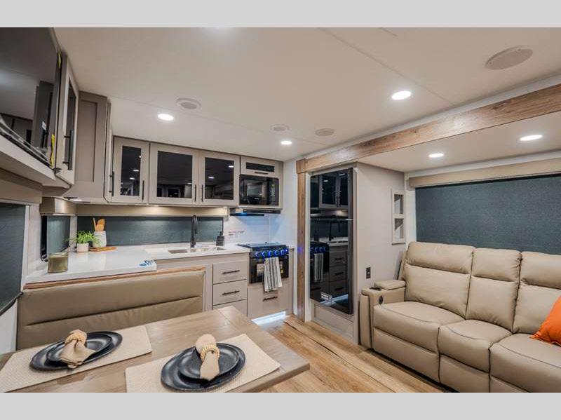 Sleeps 4 Slides 2 Length 33 ft 11 in Ext Height 11 ft 3 in Hitch Weight 802 lbs GVWR 9450 lbs Dry Weight 7486 lbs Fresh Water Capacity 45 gals Grey Water Capacity 90 gals Black Water Capacity 45 gals Available Beds Queen Refrigerator Type 12V Refrigerator Size 10 cu ft Cooktop Burners 3 Shower Size 30" x 36" Number of Awnings 2 TV Info LR 50" TV Awning Info 10' and 21' Axle Count 2 Shower Type Standard Electrical Service 50 amp Solar Wattage 400 watts Similar Floorplans