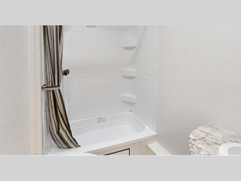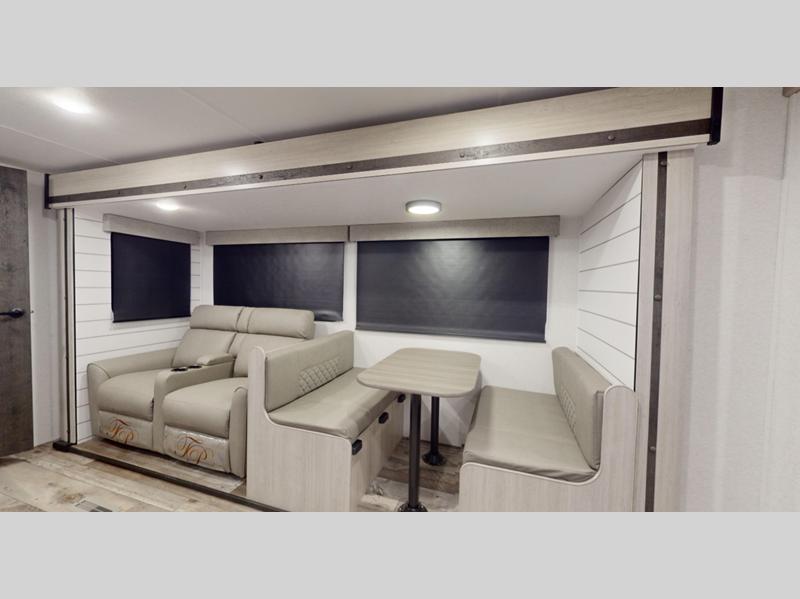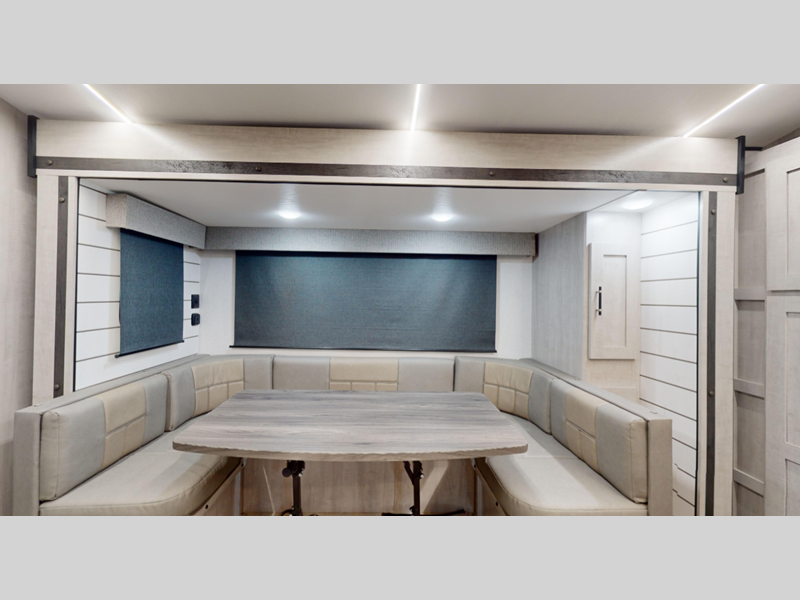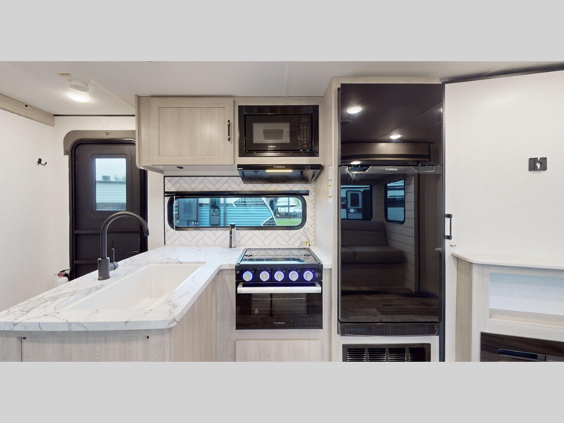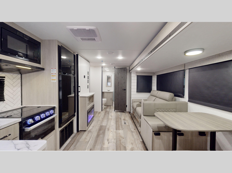 Each model features an enclosed and heated underbelly for added protection plus a one-piece seamless super flex roof for added strength. There are also magnetic slam latch doors outside, along with solar power prep, backup camera prep, and a power awning with LED lights. Inside, you'll enjoy the hardwood cabinet doors, solid surface kitchen countertops, a decorative bedspread and many more comforts.
